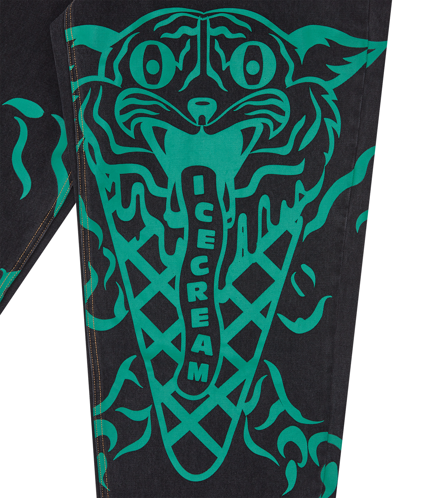 The ICECREAM Fall ’25 Triple Scoop Denim Pants blend bold streetwear energy with signature brand detailing. Crafted from 100% cotton denim, these baggy-fit pants feature a standout screen-printed graphic on the front and drip-style embroidery across the back pockets. An embroidered cone at the coin pocket and a woven back patch add elevated touches, while the branded button and zip-fastened fly complete the look. Designed for comfort, durability, and unmistakable ICECREAM attitude. Baggy fit